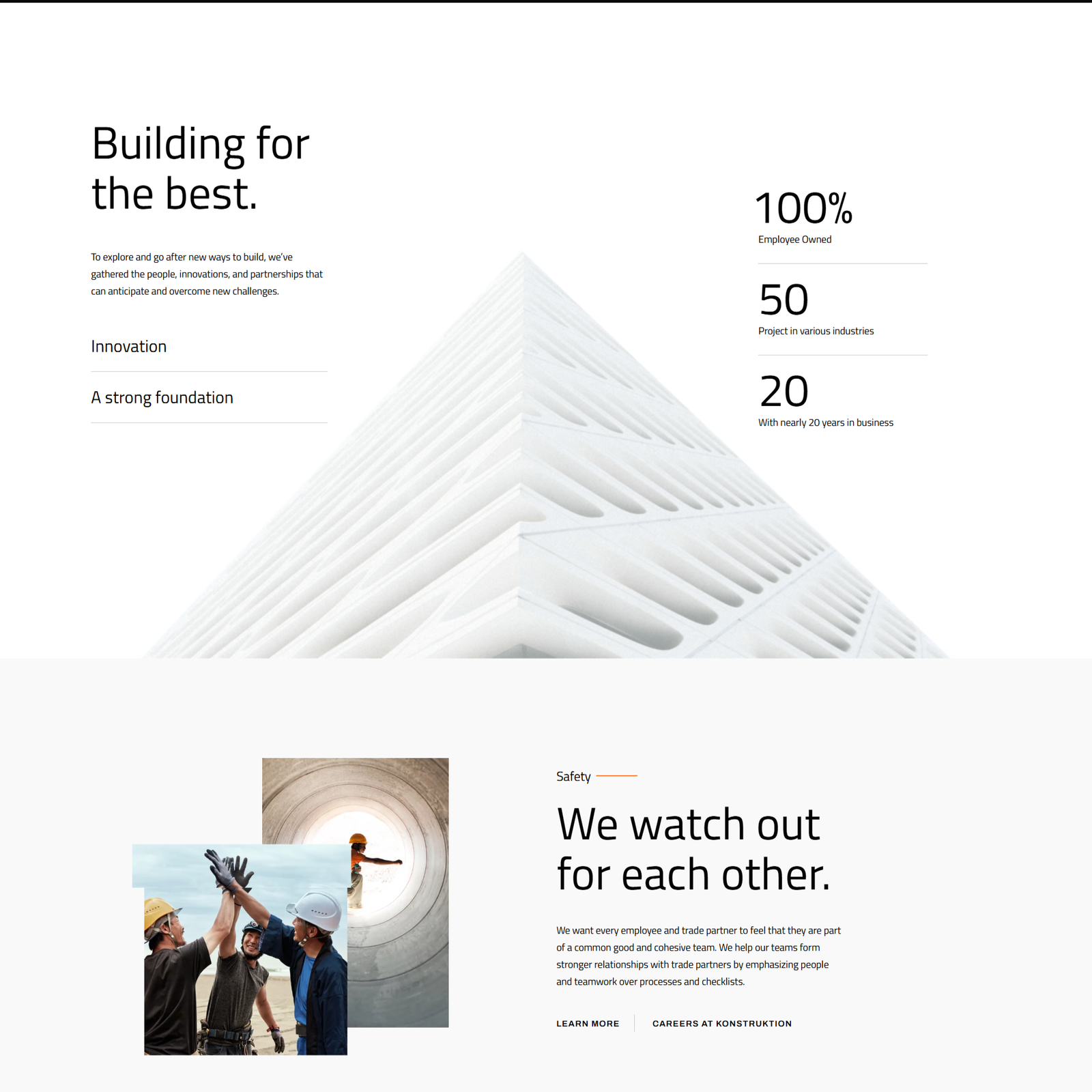 We began by understanding the multiple audiences visiting Konstruktion’s site — potential clients, trade partners, and talent. From there, we designed a streamlined information architecture and visual identity system that highlights the company’s: